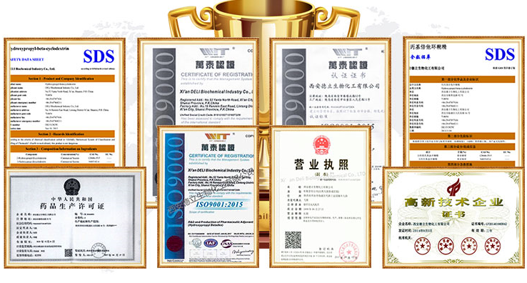 Xi’an Deli Biochemical Industry Co., Ltd. je visokotehnološko podjetje, specializirano za raziskave in razvoj, proizvodnja in prodaja ciklodekstrinov in njihovih derivatov. Strankam po vsem svetu dobavljamo farmacevtske pomožne snovi s stabilno kakovostjo in zanesljivo storitvijo.